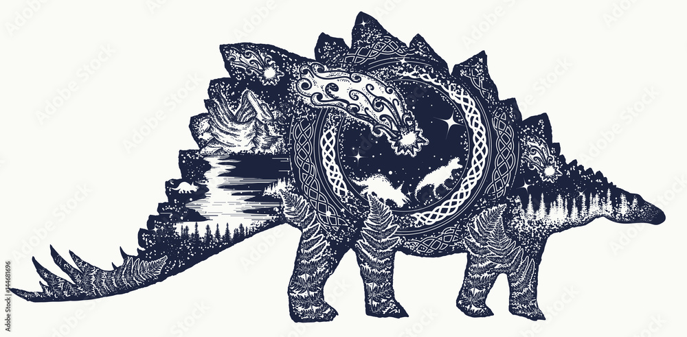 Stegosaurus Tattoo Art Comet Has Destroyed Dinosaurs Symbol Of Prehistoric Paleontology Stegosaurus Double Exposure T Shirt Design Why The Dinosaurs Died Out Stock Vector Adobe Stock